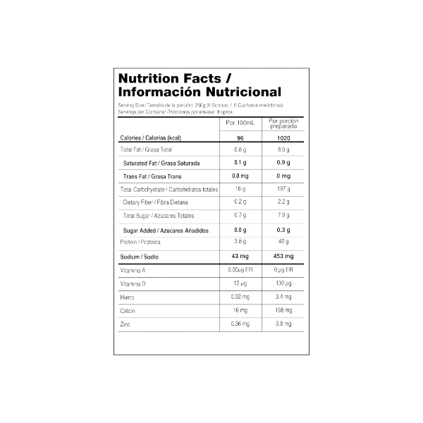 Ingredientes: Mezcla de carbohidratos (Maltodextrina (Almidón hidrolizado de maíz) almidón de maíz), Proteína concentrada de suero lácteo, Proteína de soya, Crema no láctea (jarabe de glucosa, aceite de palma, proteína, saborizante, emulsificante y agente anticompactante), sabor natural y/o artificial a vainilla, mezcla de gomas (gomas guar y goma xantana) (espesantes), Prebióticos, Dióxido de silicio (anticompactante), Sucralosa (educorante artificial), Vitamina C, Aminoácidos de cadena ramificada (l-leucina, l-isoleusina y l-valina), Glutamina, Probióticos, Premezclas de vitamina (niacinamida, zinc, tiamina monohidrato, riboflavina, cianocobalamina), Vitamina D3.